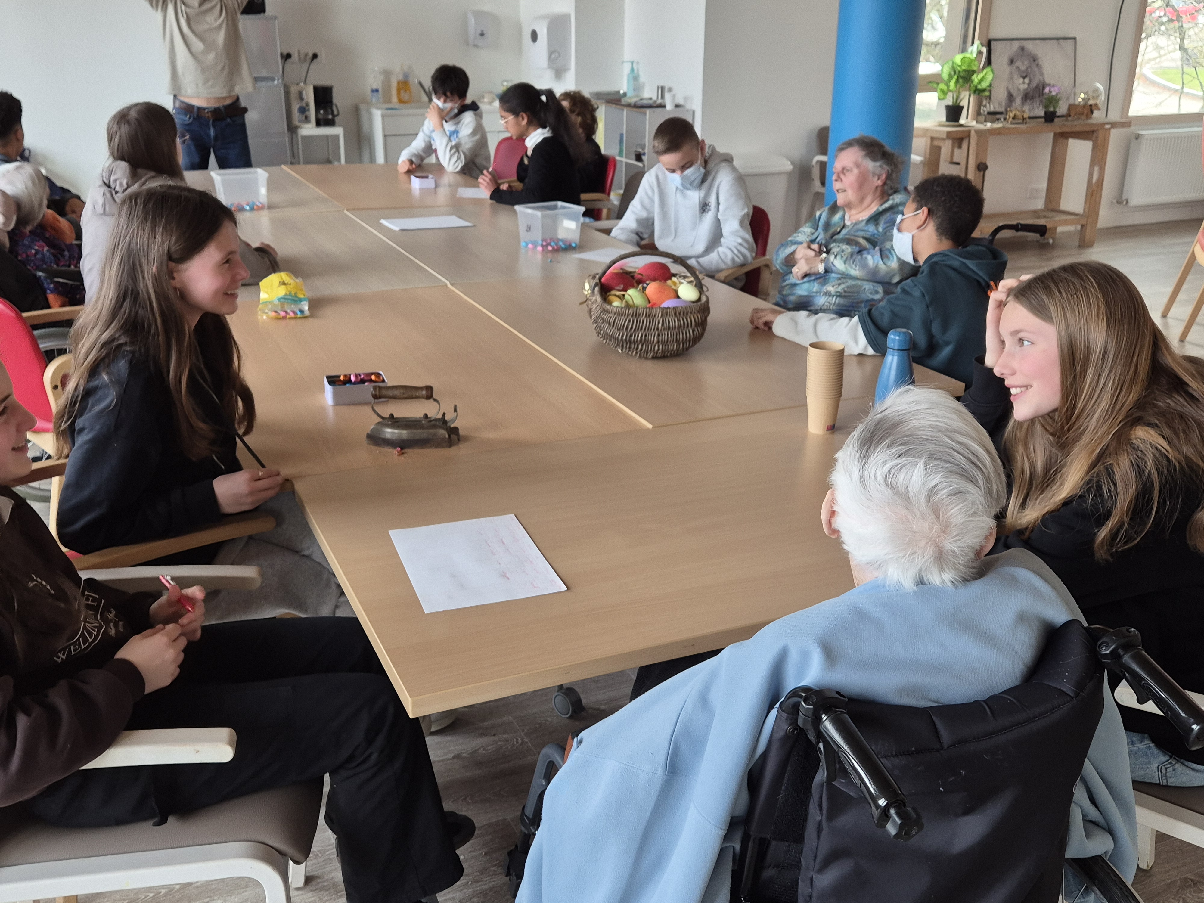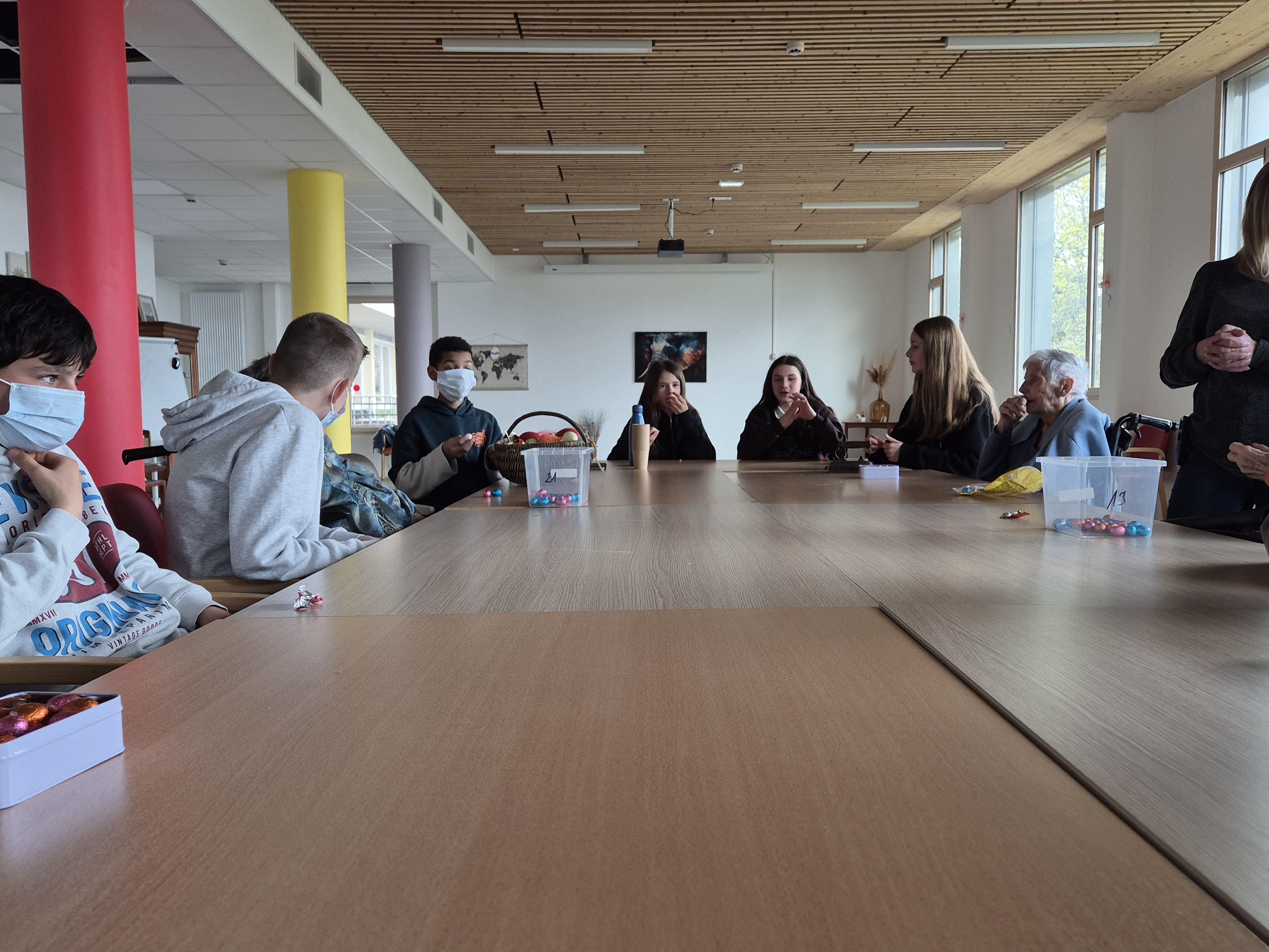 4 élèves de 5eA, accompagnés de 5 élèves de 5eF et 1 élève de 4eC se sont rendus à l’EHPAD Salève-Glières à Cruseilles pour une quatrième rencontre avec quelques résidentes et pour faire une chasse aux œufs !