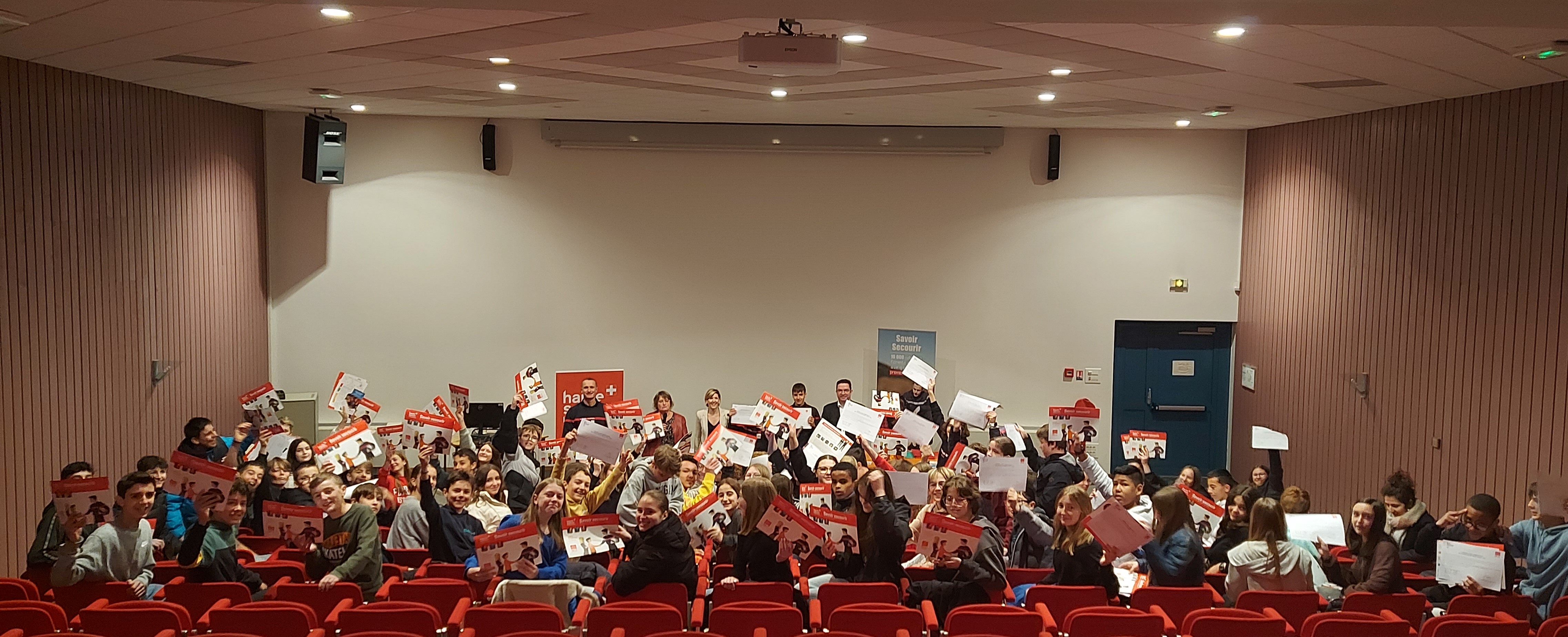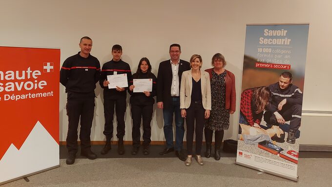 Deux jeunes sapeurs-pompiers volontaires, Perrine VEJUX et Thomas SZYNDRALEWIEZ ont également animé cette cérémonie . Cette formation PSC1 entièrement financé par le Conseil Départemental de la Haute Savoie et déployée en lien avec le SDIS74. Elle permet aux élèves d’acquérir les compétences nécessaires à l’exécution d’une action citoyenne d’assistance à personne en réalisant les gestes élémentaires de secours.