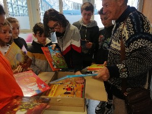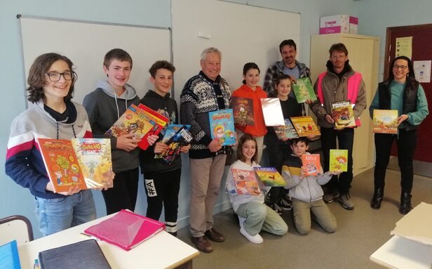 La remise des livres, tant attendue, par M. MONTGERMONT, Président de l'APECLA, a été le moment d'un bel échange. Les titres variés ("DAD", "Gobelins", Lucky Luke", "à cheval", ...)