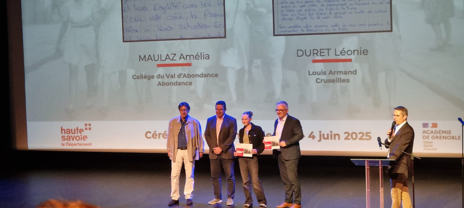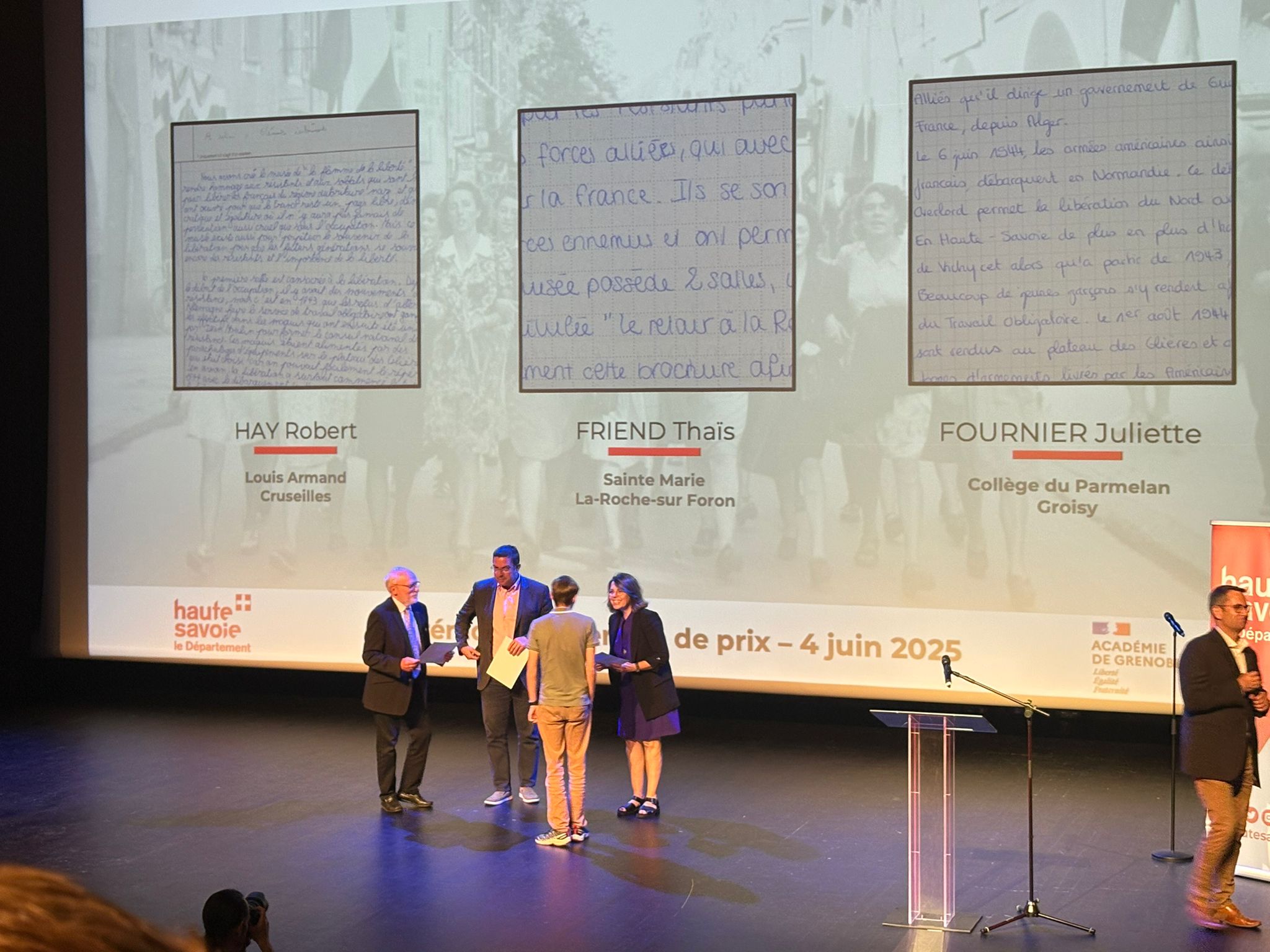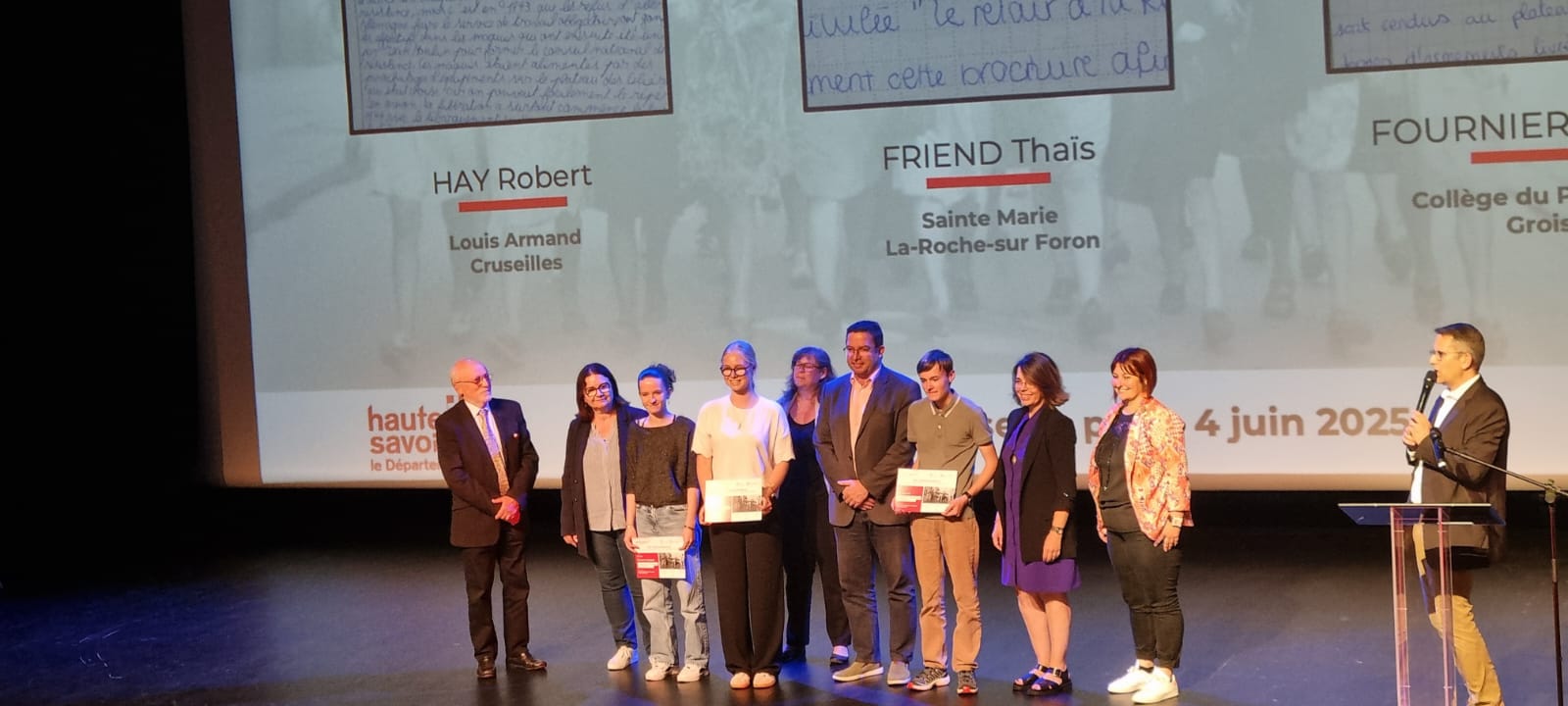 Le mercredi 4 juin à Poisy, les élèves du collège Louis Armand ont été mis à l'honneur lors de la remise des prix départementaux du Concours National de la Résistance et de la Déportation (CNRD). Une cérémonie émouvante, en présence de collégiens et de lycéens venus de tout le département et de leurs professeurs, de membres d’associations de mémoire et d’élus haut-savoyards.