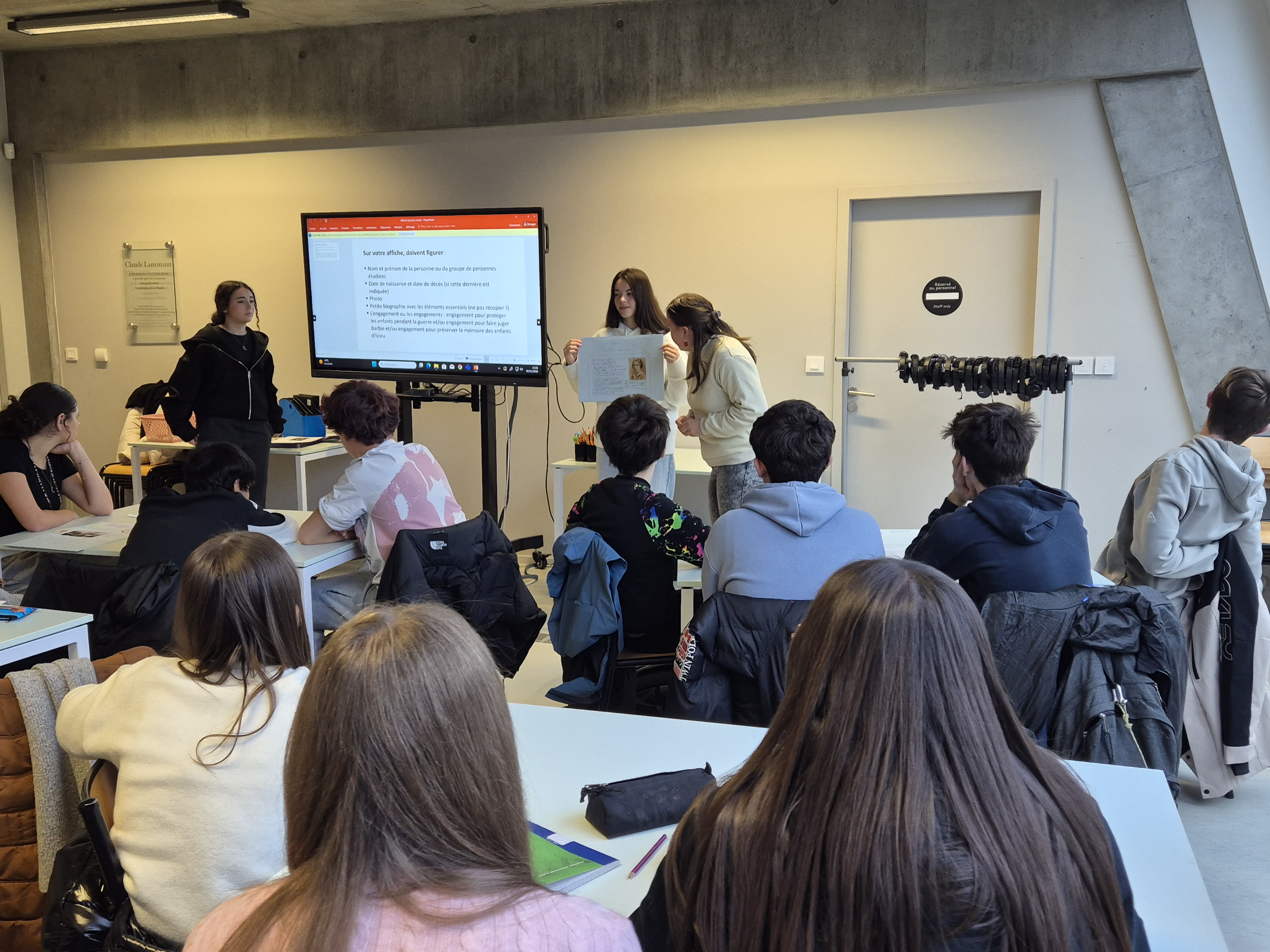 Durant la matinée, les élèves ont donc pu travailler sur cette thématique à travers des ateliers durant lesquels ils ont étudié les biographies des personnes ayant œuvré pour protéger les enfants d’Izieu : Sabine et Miron ZLATIN, Gabrielle PERRIER-TARDY ou encore Léa FELDBLUM. Ils ont réalisé des affiches de chacune de ces personnes en mettant en évidence leurs engagements.